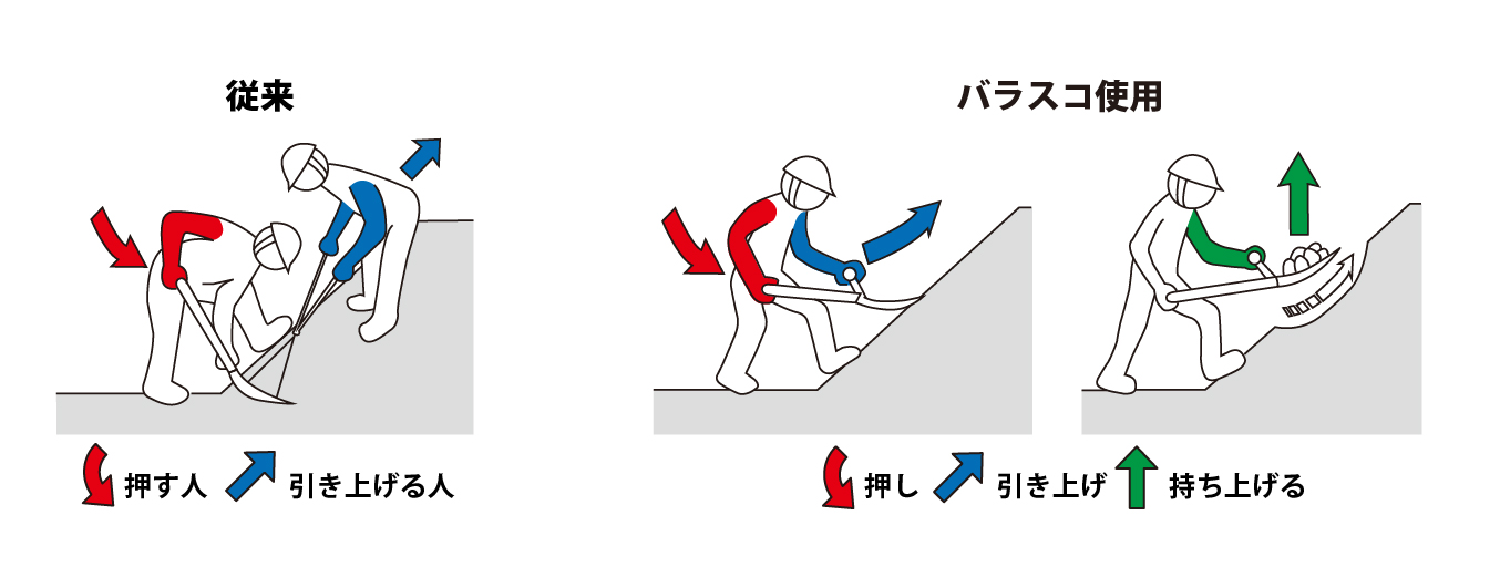 Ballasco™ 砕石整理用器具 砕石に刺さりやすく落ちにくい間隔に爪を配置、補助ハンドルにより砕石の中へ引きこむ力を増大させ、軽い力で持ち上げる事が可能になります。力を効率よく使えるため、従来の二人スコップ(砕石かき上げ作業)の仕事量を一人分に換算すると、約1.5倍となります。 ※当社独自テストによる参考値 重量 約2.5kg カタログ ←作業機械