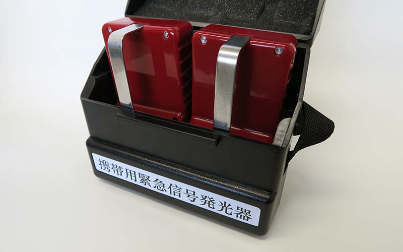 携帯用緊急信号発光器 乾電池式表示色:赤色 見張員携帯用。JR東日本承認 本案第90号 発光は約7Hzで60分間現示可能。スイッチを押すと発光と同時に電子音も鳴ります。 1個につき単三電池2本使用。底部にはマグネットも付いています 表示色 赤色 見通し距離 800m以上 表示継続時間 60分/個 現示所要時間 3秒 ケース寸法 145mm×165mm×70mm 構成部品 発光器2個、収納ケース1個、単三電池4本 カタログ