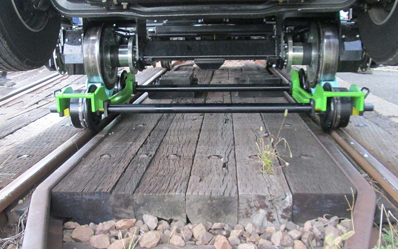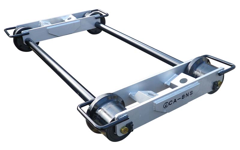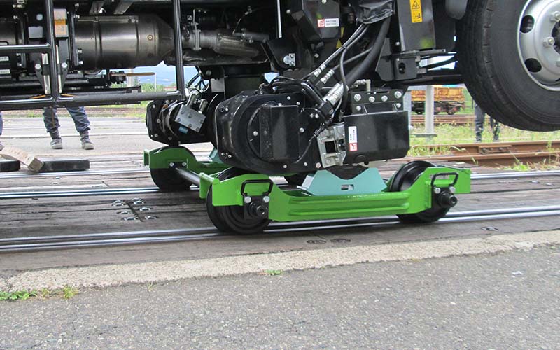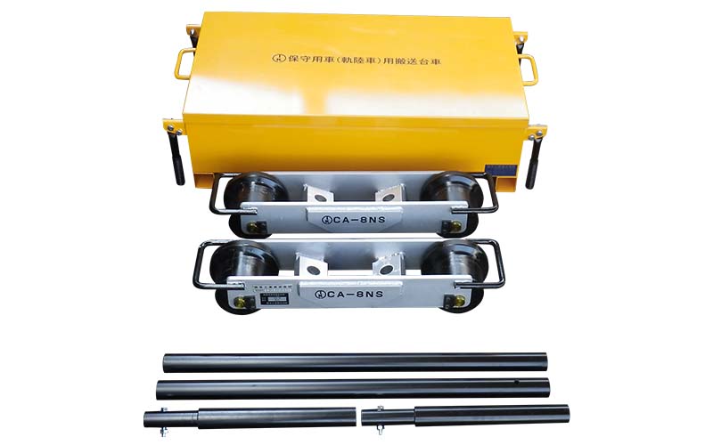 故障軌陸車の鉄車輪を運搬台車のフレームセンター部で受け搬送。分割重量を最大でも約41Kg程度に抑えている為、復旧現場において2名での組立が可能になっています。