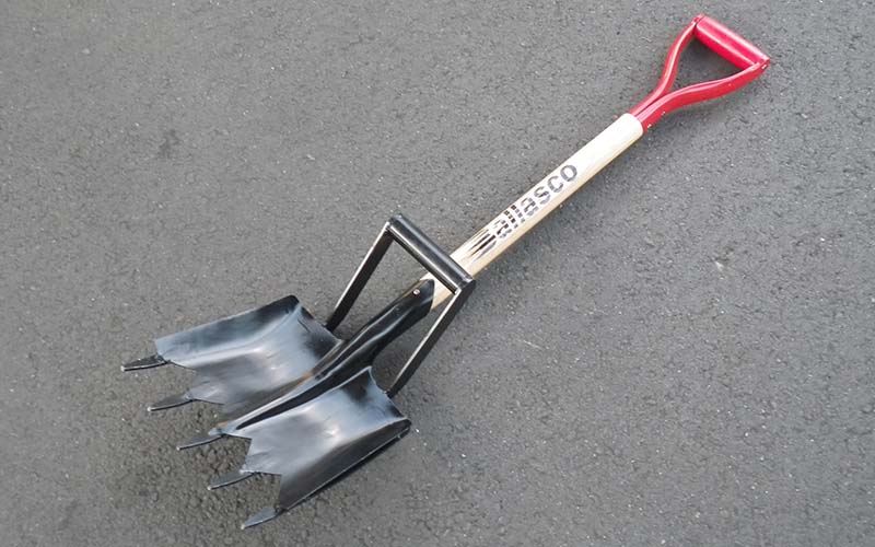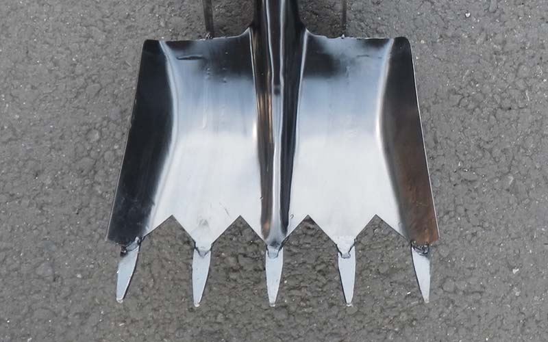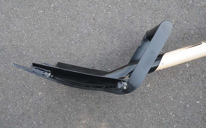 Ballasco™ 砕石整理用器具 砕石に刺さりやすく落ちにくい間隔に爪を配置、補助ハンドルにより砕石の中へ引きこむ力を増大させ、軽い力で持ち上げる事が可能になります。力を効率よく使えるため、従来の二人スコップ(砕石かき上げ作業)の仕事量を一人分に換算すると、約1.5倍となります。 ※当社独自テストによる参考値 重量 約2.5kg カタログ ←作業機械
