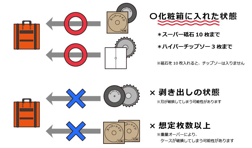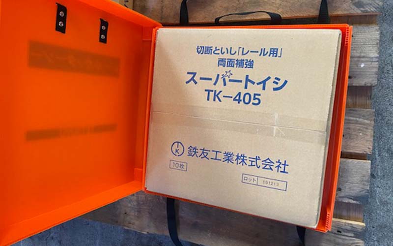 レールカッターソーケース 弊社製品のニューレールカッターとハイパーレールカッターで使用する、切断砥石やチップソーを収納することができます。 プラスチック段ボール製のため水に強く、作業現場への持ち運びの際の損傷を防ぎます。 寸法 475mm×450mm×70mm(内寸:435×430×60) 収納枚数 スーパー砥石TK-405 10枚(1箱) ハイパーチップソー365 3枚(3箱) カタログ