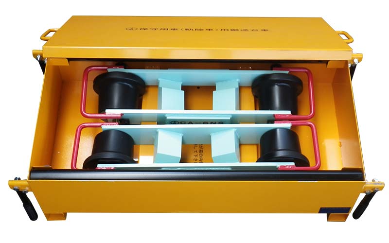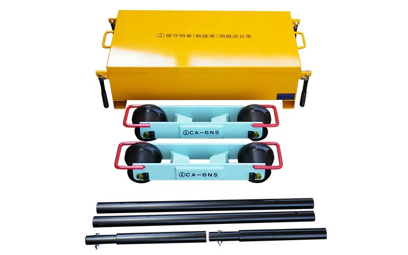 保守用車用搬送台車 CA-6NS 軸重6t 故障軌陸車の鉄車輪を運搬台車のフレームセンター部で受け搬送。分割重量を抑えている為、復旧現場において2名での組立が可能になっています。 ※軸重約6t以下の垂直荷重、G=1067、G=1435に対応。 G=1067は連結パイプのみ、G=1435は連結パイプとジョイントパイプを使用します。ひとつの箱に分解しての収納が可能となっており、収納状態での運搬を可能とするため、ボックスの四隅に運搬用のハンドルを標準で装備しています。 許容積載荷重 6t以下(軸重) 積載軌陸車輪径 φ240~480 カタログ